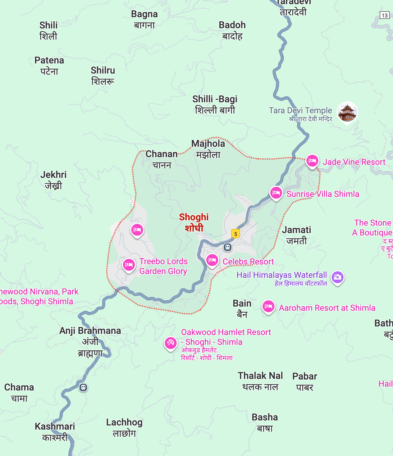 Shoghi is a small hill village located about 13 kilometres before Shimla on the Kalka–Shimla highway (NH 22). It is a scenic hill station situated at an approximate altitude of 1790 meters and is known for its temples, natural surroundings, and adventure activities.